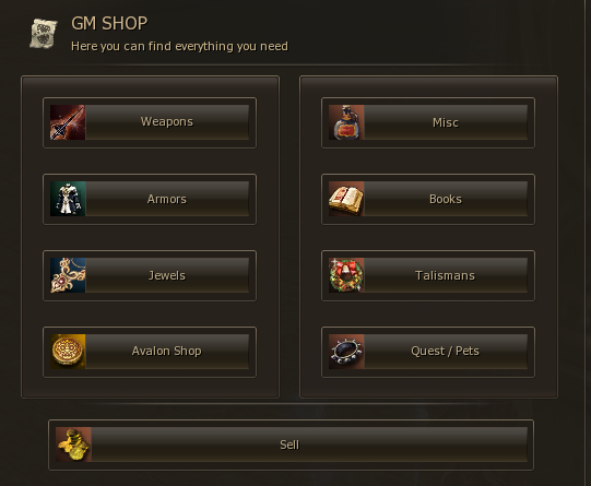 Gear accessFull B-grade for AdenaA-grade for crystalsTop A weapons: Adena / crystals + special items from Primeval questsSuppliesAll supplies up to A-gradeTalisman section available