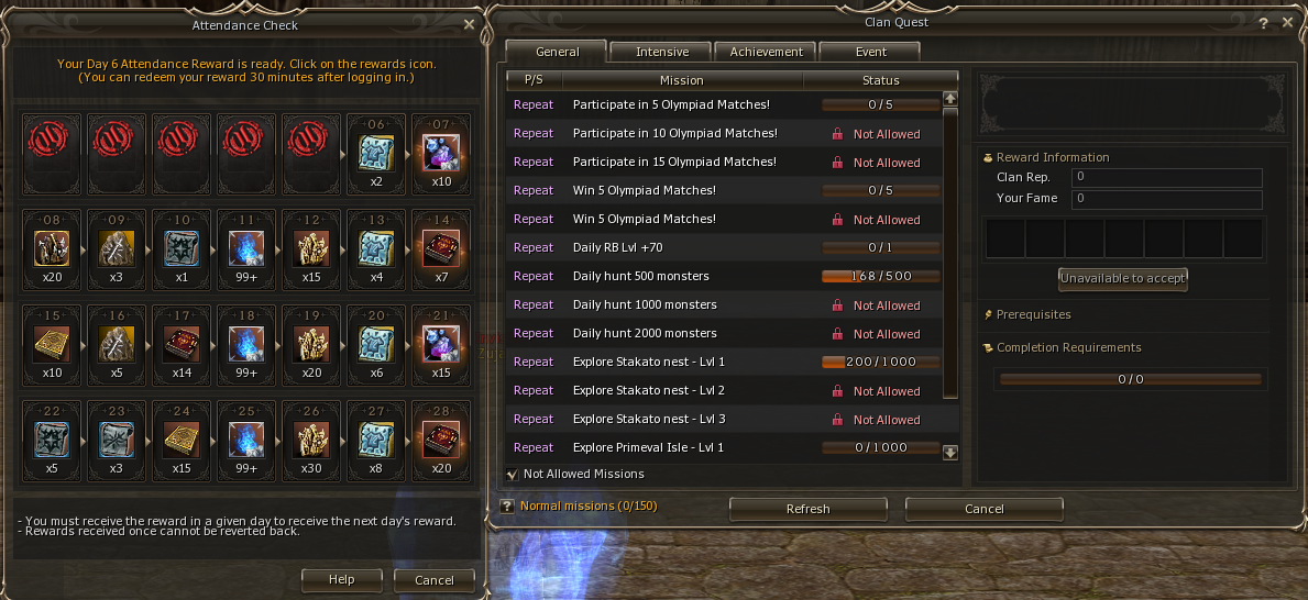 DailyInstances (daily tasks + rewards)WeeklyOlympiad participation goalsFarm locations objectivesOne-timeLeveling progression missions